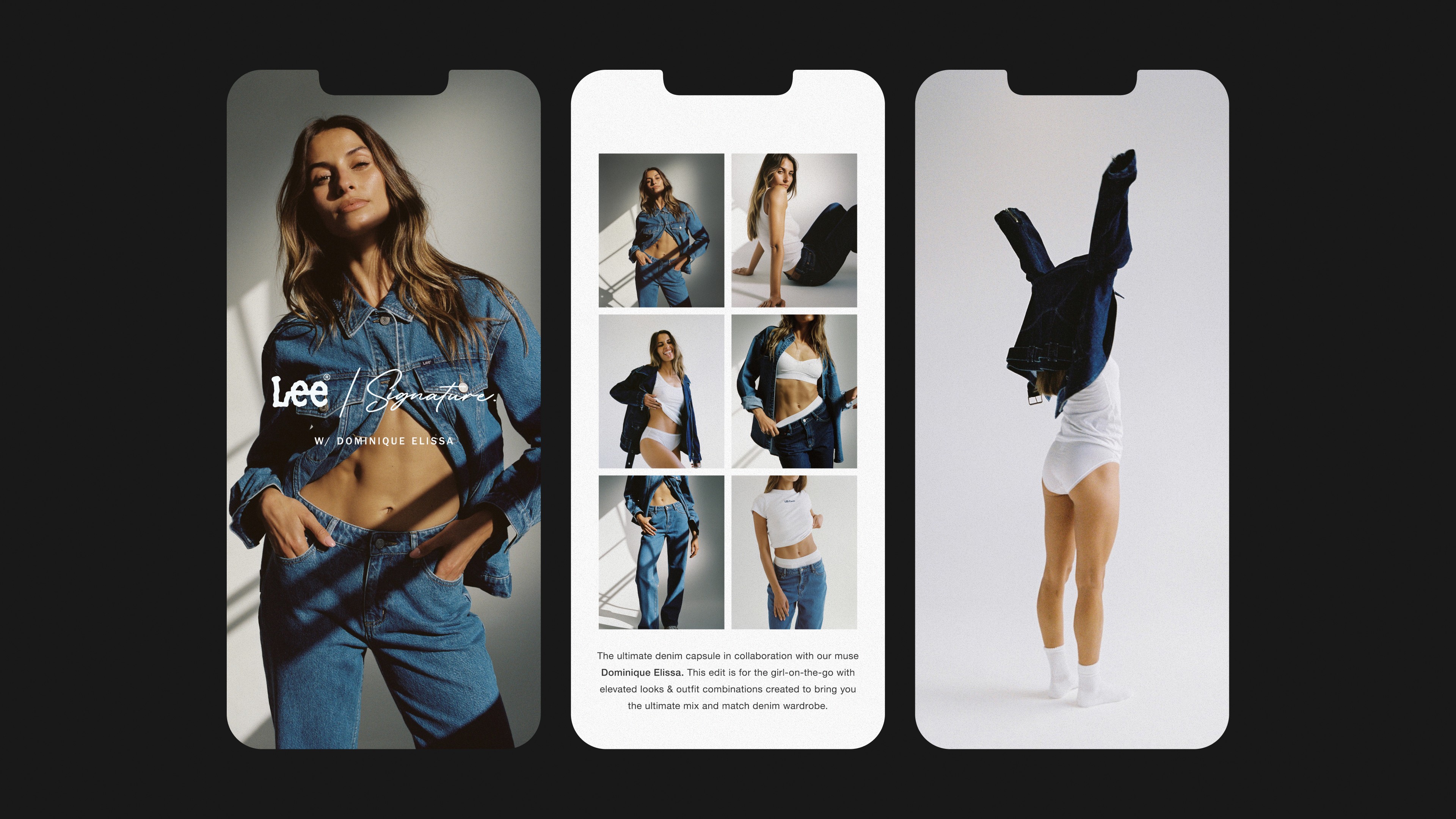 Signature was a limited-edition womens capsule created to reignite momentum in Lee’s women’s category. The campaign focused on rebuilding brand heat through elevated styling and authentic influencer partnerships. Collaborations with Dom Elissa and Gabi Sullivan helped amplify awareness and connect with a broader female audience, positioning Signature as a premium, aspirational collection that renewed excitement around Lee womenswear. The creative direction focused on effortless styling, soft tones and a minimal, modern aesthetic that reflected longevity and ease.